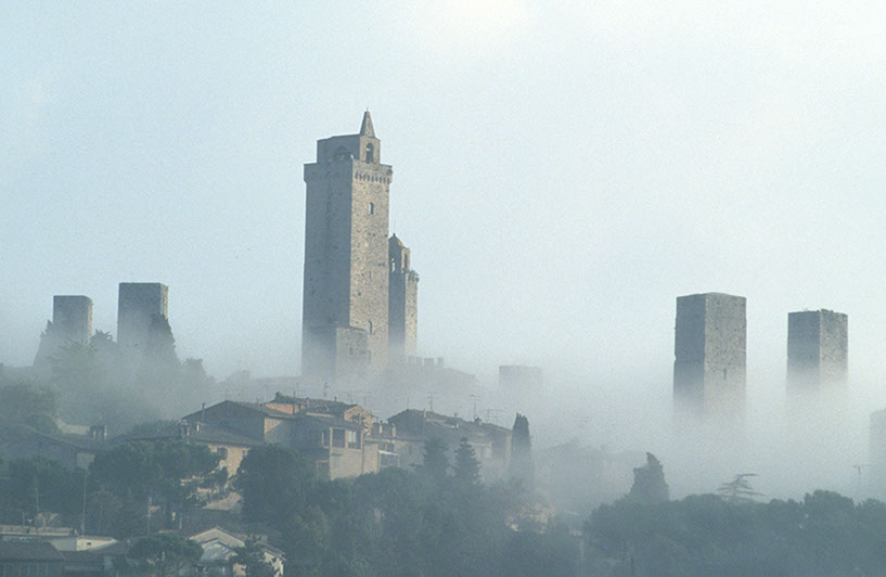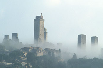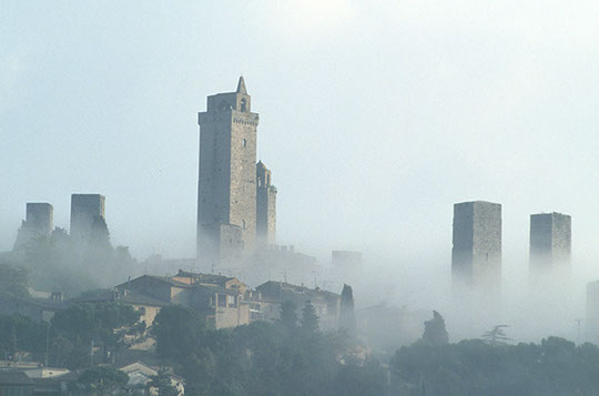 San Giminiano im Morgennebel, Toscana, Italien