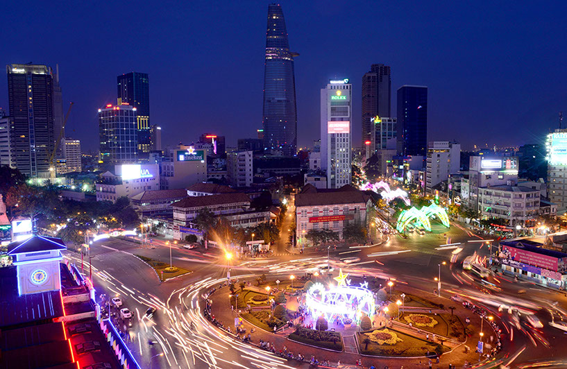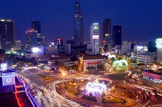 Abendlicher Blick auf die Hochhäuser von Saigon, Vietnam