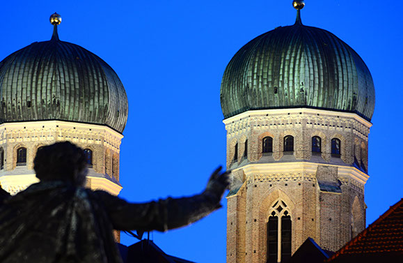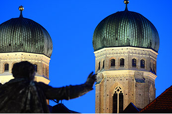 Denkmal versucht die Frauentürme zu greifen, München, Bayern