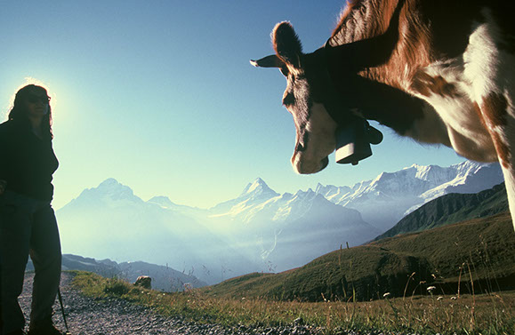 Kuh beobachtet Frau über Grindelwald, Schweiz